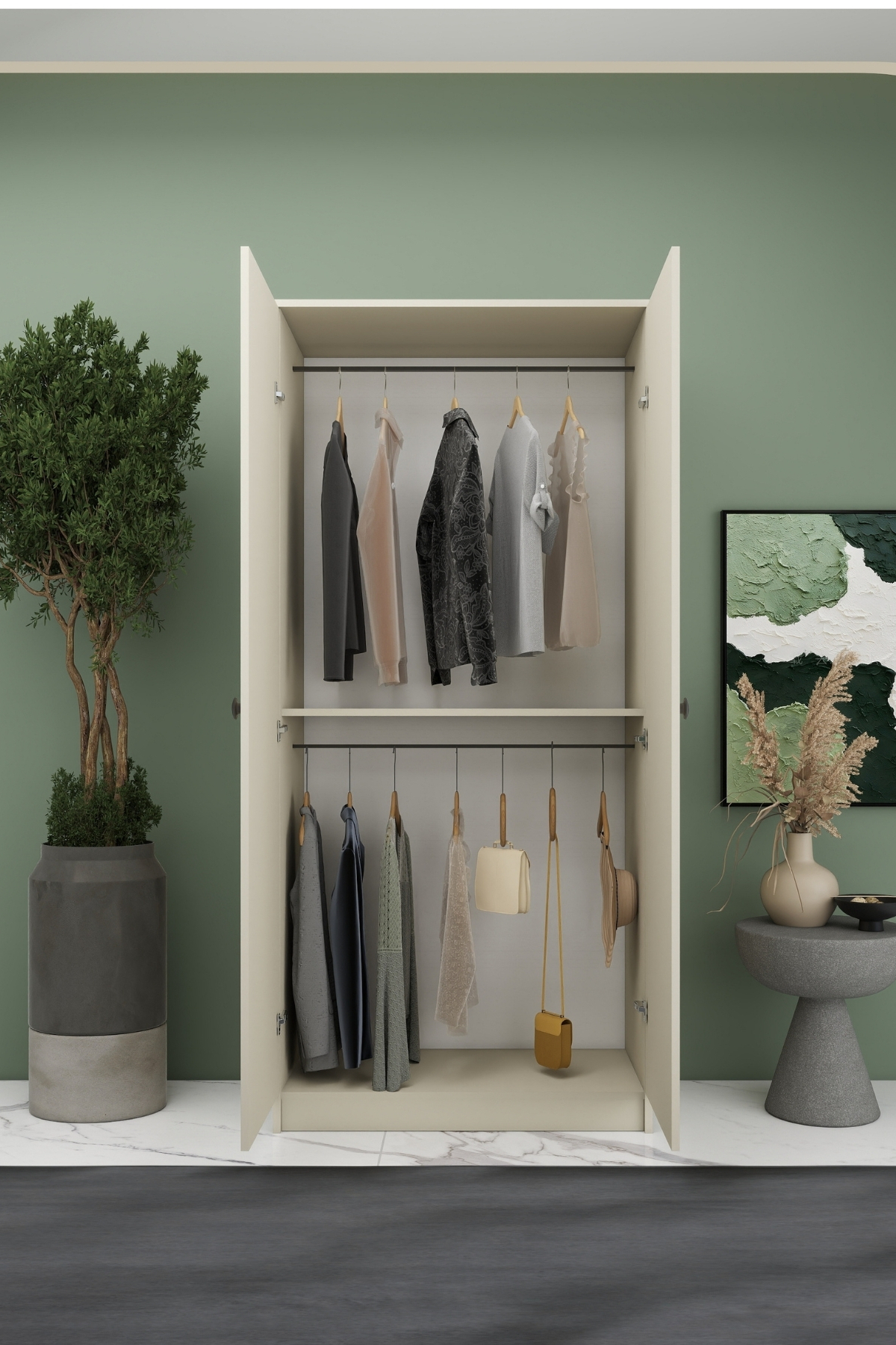 Modern ve kullanışlı tasarımıyla yaşam alanlarınıza düzen katar evinize aydınlık ve ferah bir görünüm sağlar. Askılı ve raflı iç dizaynı sayesinde kıyafetlerinizi, tekstil ürünlerinizi ve kişisel eşyalarınızı rahatlıkla depolamanıza olanak sağlar.